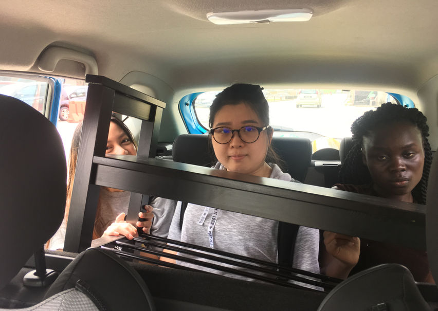 After we prepared everything for transport - assembling the bench and bolted together the PVC pipes - we readied ourselves for the final visit to Agathians Shelter. We rented a car for ease of transport and everyone could fit, though it was a little cramped. Upon arrival, everyone at the shelter were busying themselves with cleaning and preparing for Deepavali which was the next day. On site, we arranged the PVC pipes as planned and added small pieces of wood at the bottom - lifting it off the ground in the event of rain.